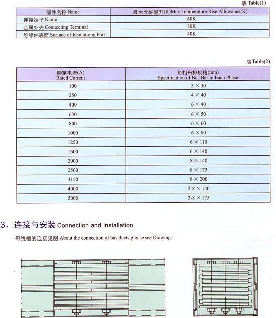 母线槽在长期通额定电流时,其导电部位的温升不超过表(1)所列的数值。
