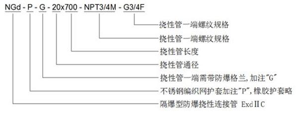 NGd系列隔爆型防爆挠性连接管有钢丝编织橡胶护套和不锈钢丝编织护套两种,适用于工厂中具有爆炸性混合物的Q-1级场所,作为防爆电器设备进出线连接软管。